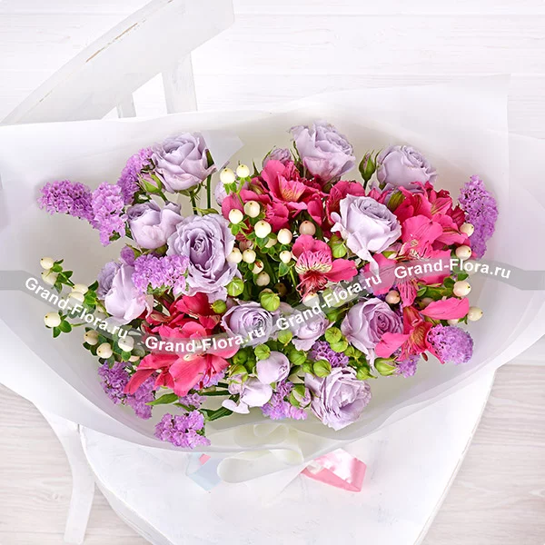 Роза кустовая светло-сиреневая (возможна замена на розовую) - 2 шт., альстромерия розовая/фиолетовая– 2 шт., гиперикум белый – 1 шт., статица светло-фиолетовая (сиреневая) – 1 шт., упаковка, лента.